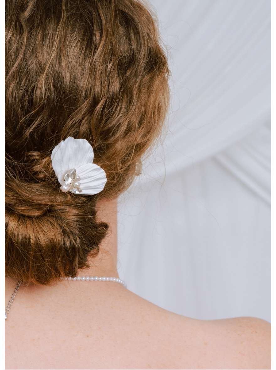 Pic à chignon constitué de pétales faits main à l'aspect porcelaine, de perles nacrées et de cristaux.